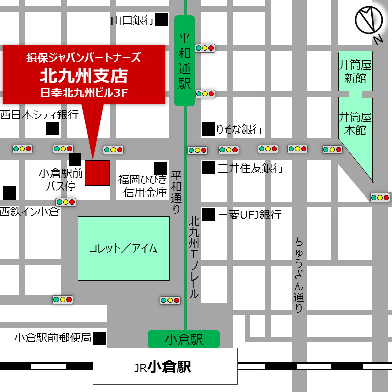 JRでお越しの際は、小倉駅南口を平和通り沿いに行き、小倉駅前交差点を左折。