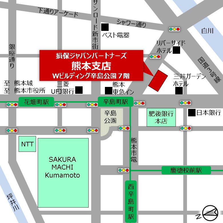 熊本駅より市電をご利用いただき、辛島町電停下車徒歩約1分。