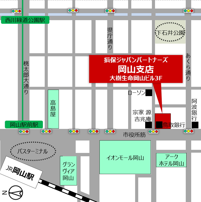岡山駅東口から徒歩約8分。市役所筋を南に向かったイオンモール岡山斜め向かいの大樹生命岡山ビル3F(1階の鳥取銀行が目印)です。