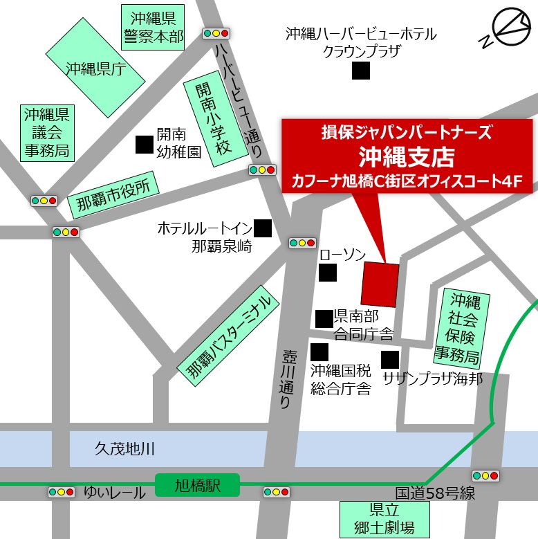 那覇都市モノレール(ゆいレール)「旭橋駅」下車、泉崎方面へ徒歩約5分。那覇バスターミナル向かい、カフーナ旭橋C街区 オフィスコートの4階。沖縄県南部合同庁舎、自治会館、ホテル東急ビズフォートと同一のビルです。1階正面エレベーターより2階エントランスフロアにお進みいただき、オフィスビル塔の