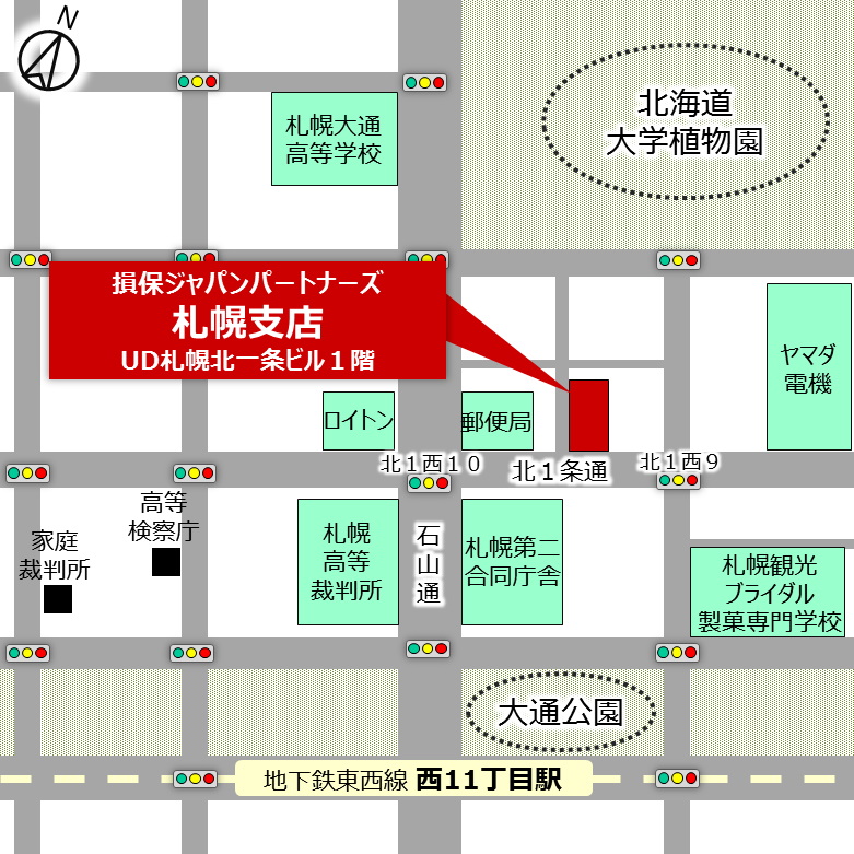 当支店は2005年7月より営業を開始しております。事務所は、地下鉄東西線「西11丁目駅」から徒歩約3分、北1条通りに面しておりますので、皆様のご来店を心よりお待ちしております。 保険に関するご質問やご不明な点など、スタッフがわかりやすくご説明いたしますのでお気軽にお立ち寄りください。