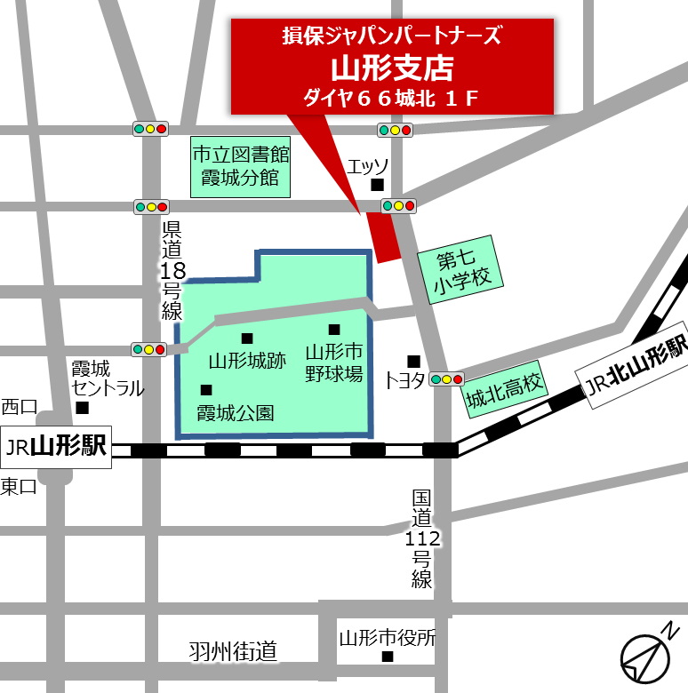 JR山形駅西口を出て、駅を背に直進し信号3つ目(約400メートル 安達接骨院あり)を右折、約1キロメートル進みエッソのガソリンスタンド向かい側に山形支店があります。